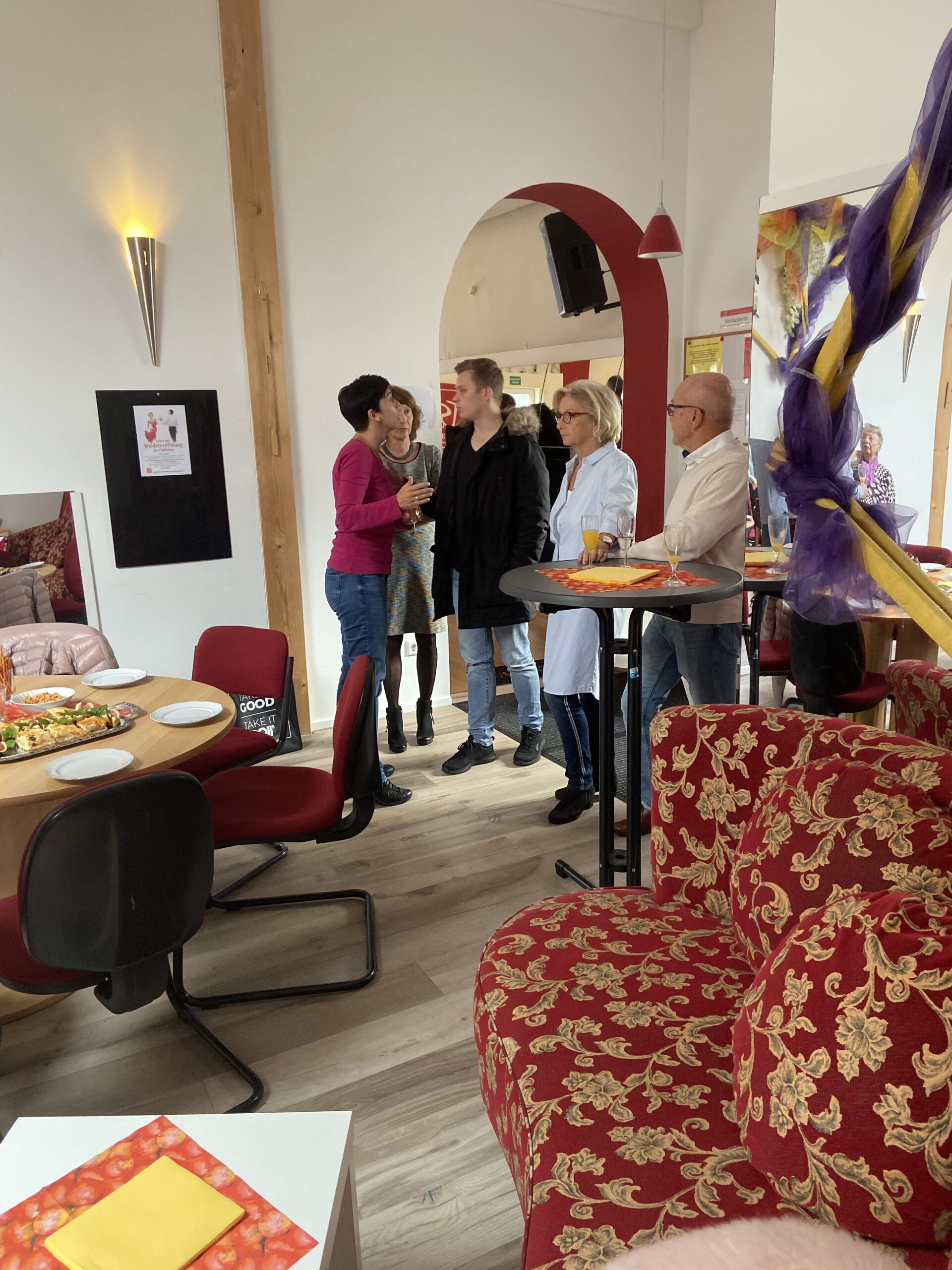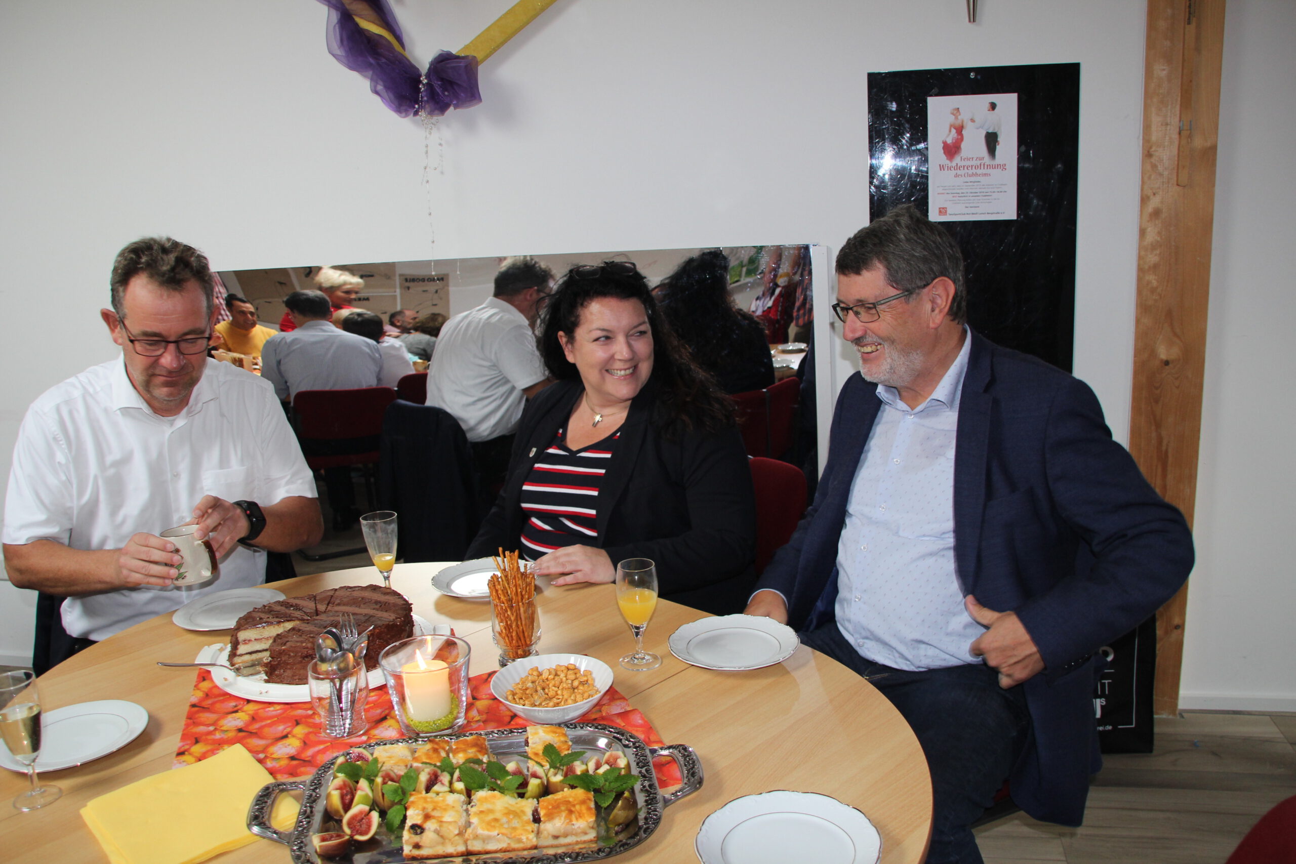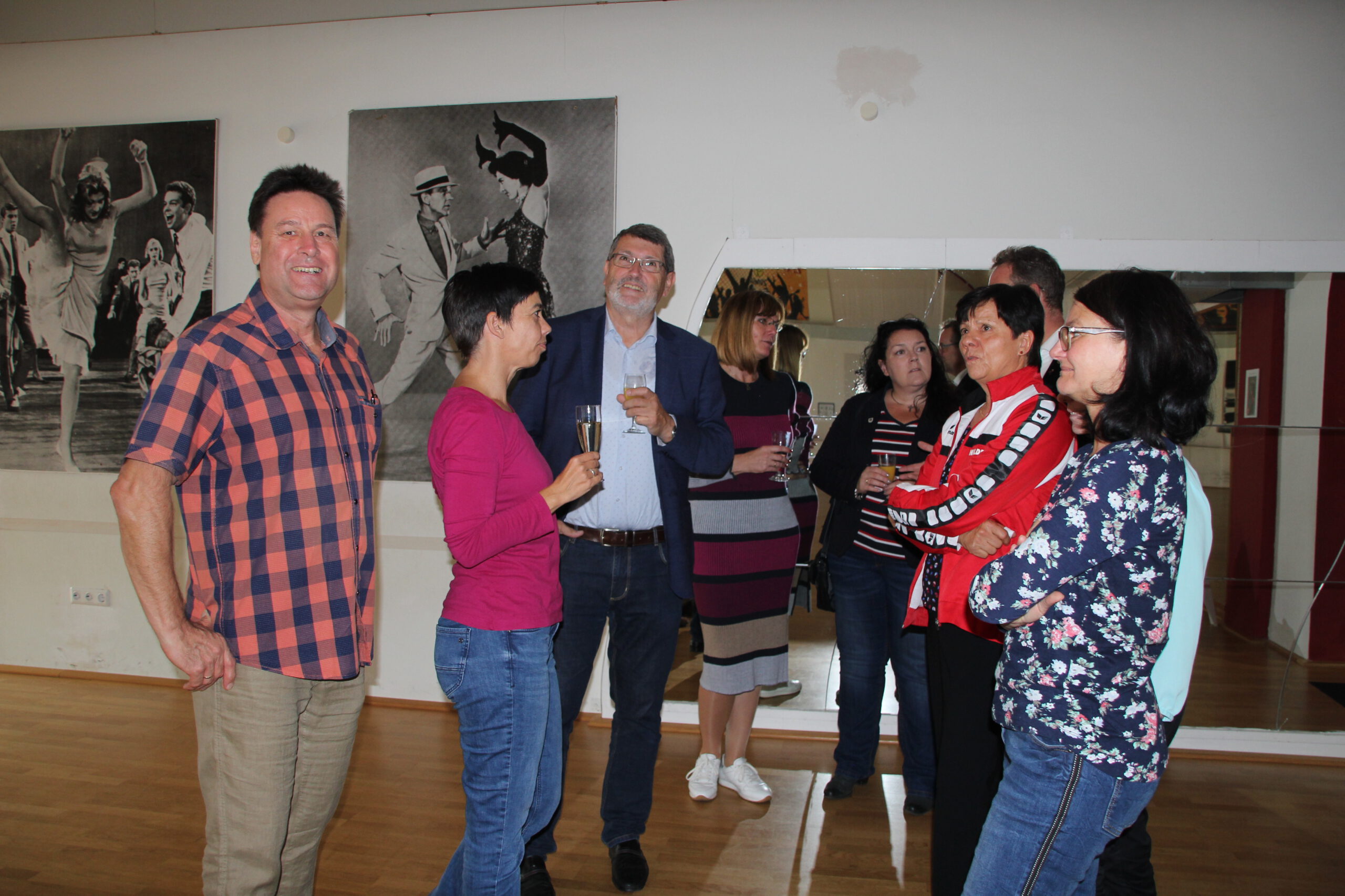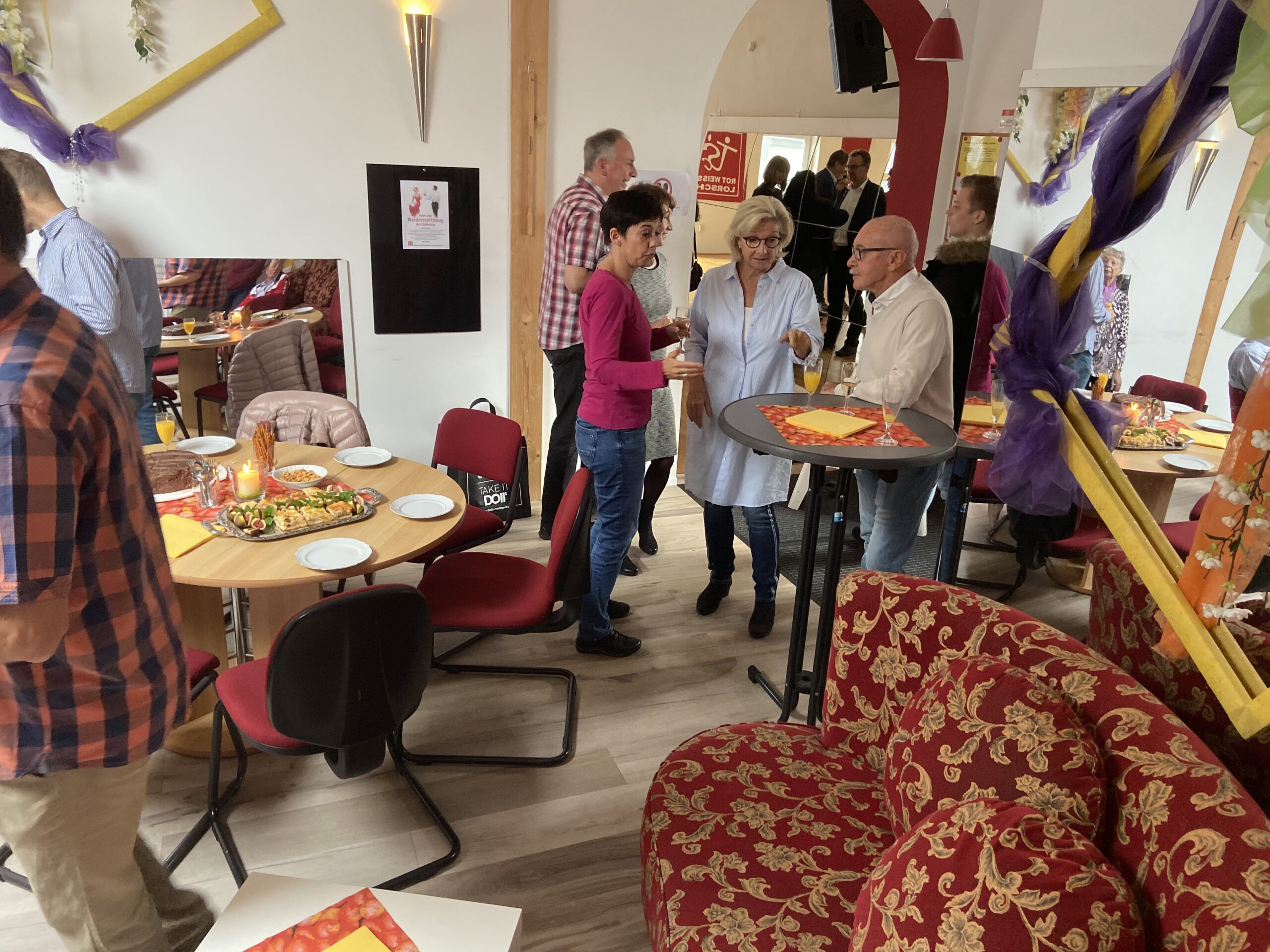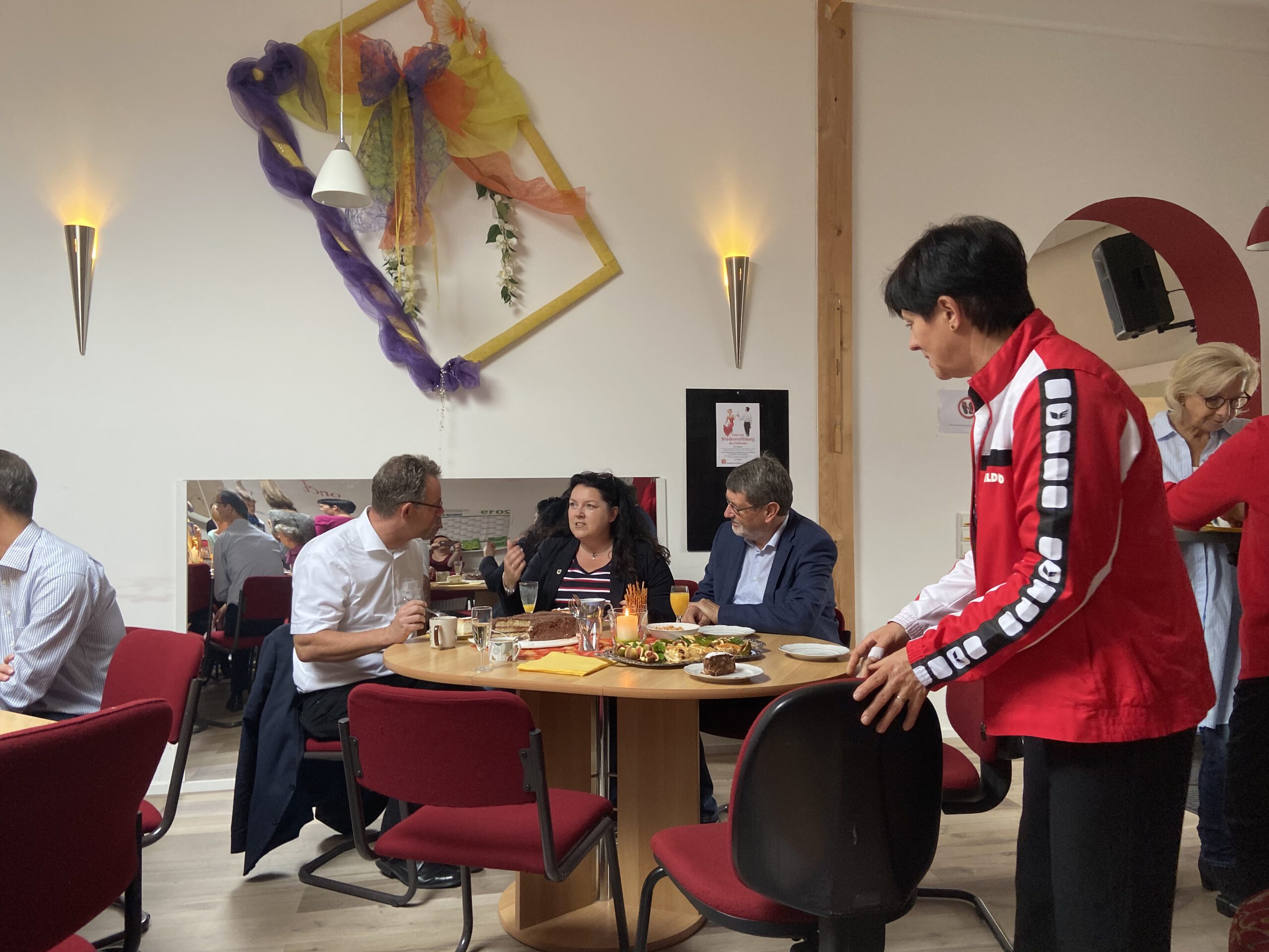 Die “Wiedereröffnung” des Clubheims ist für uns Tänzer natürlich eine willkommene Gelegenheit, eine Flasche Sekt zu öffnen und zu feiern. Außerdem mit Kaffee und Kuchen ausgestattet haben wir uns zusammen mit Bürgermeister Christian Schönung, Erstem Stadtrat Klaus Schwab und der Stadtverordnetenvorsteherin Christiane Ludwig-Paul sowie den Gründungsmitgliedern Hans-Jürgen und Brigitte Sander getroffen und gefeiert. Und neue Pläne wurden auch geschmiedet, denn im nächsten Jahr möchten wir unseren 40. Geburtstag feiern.
