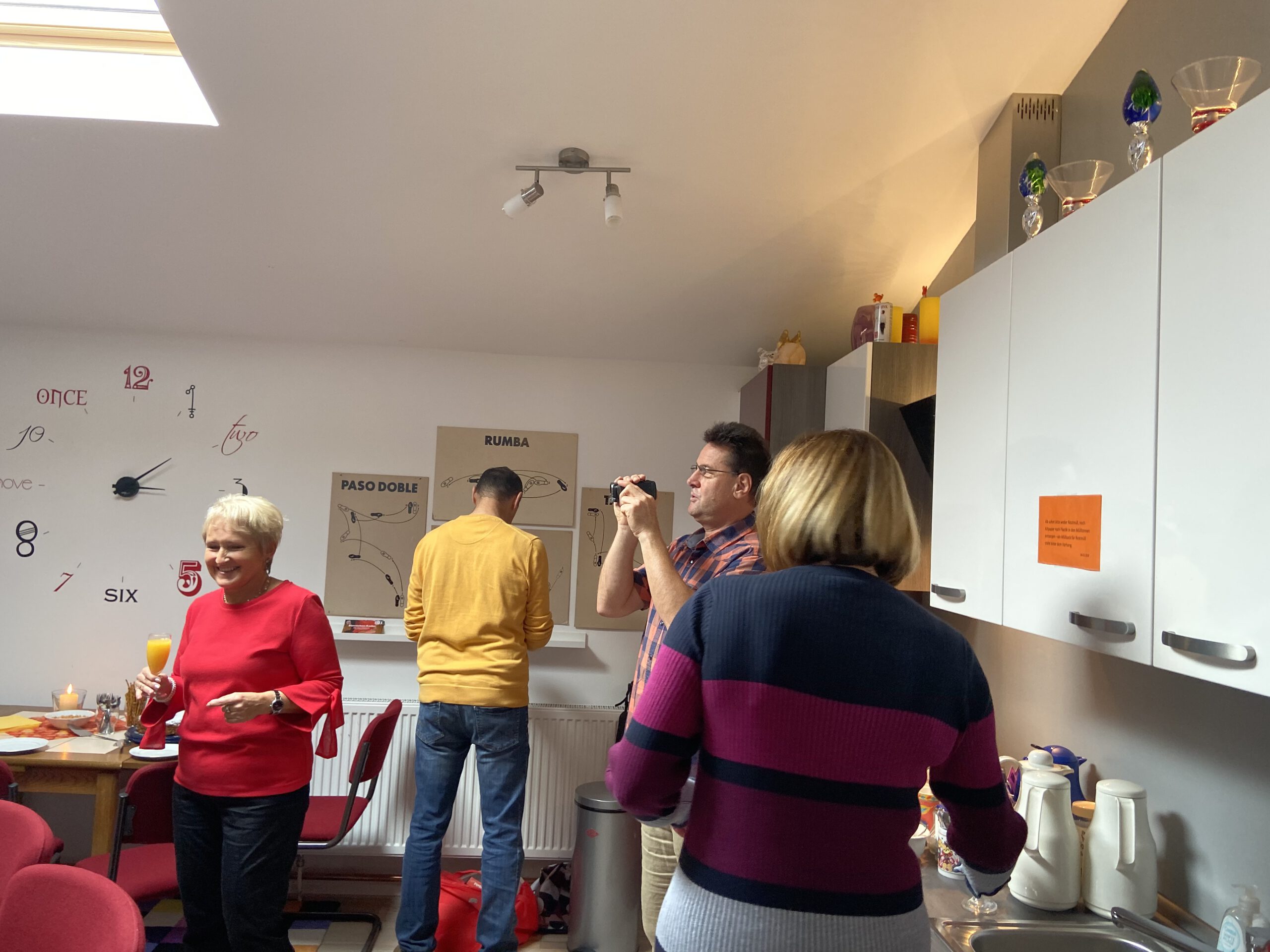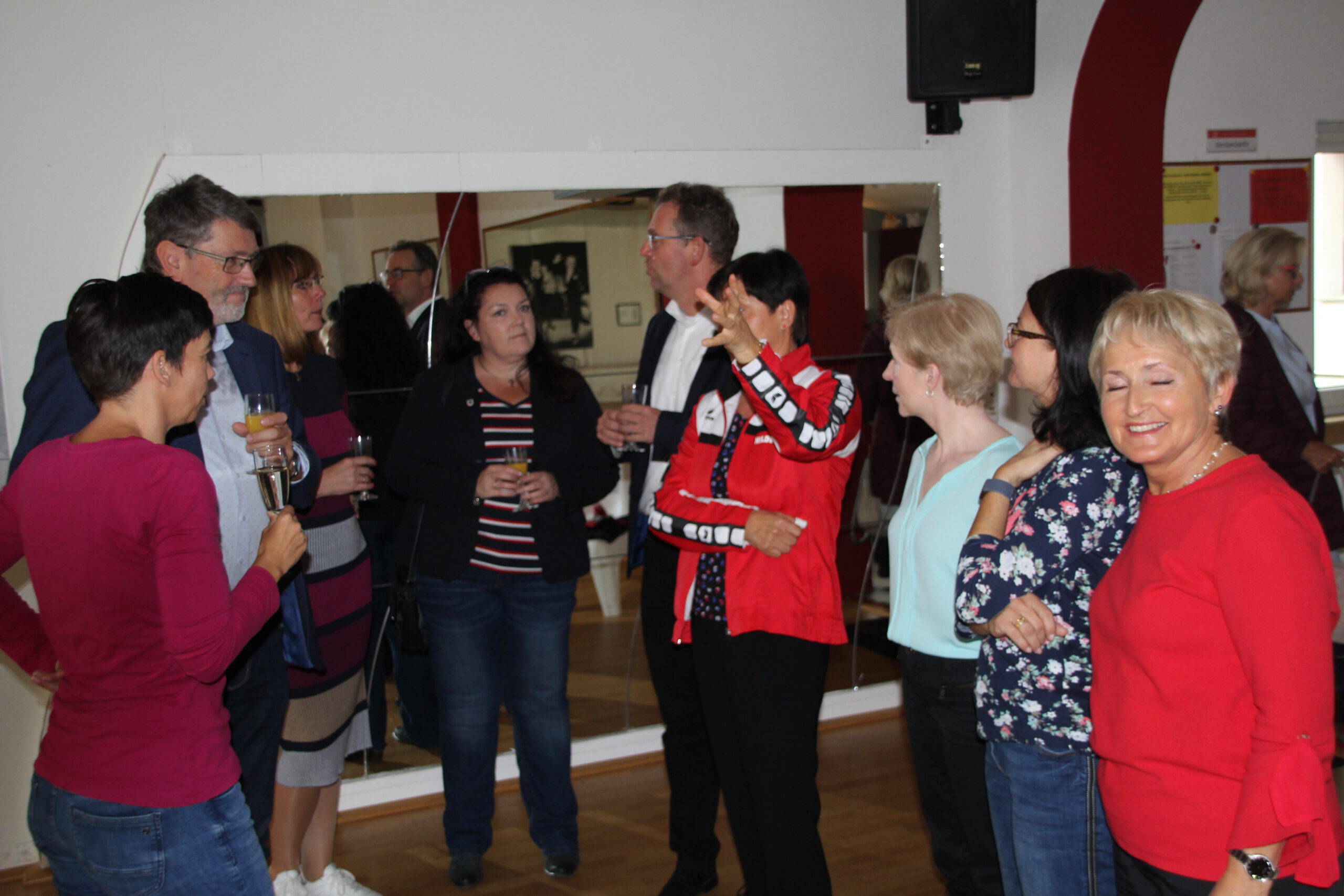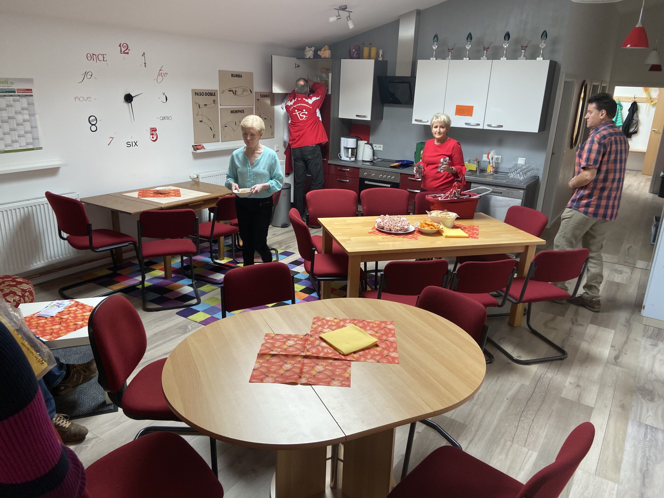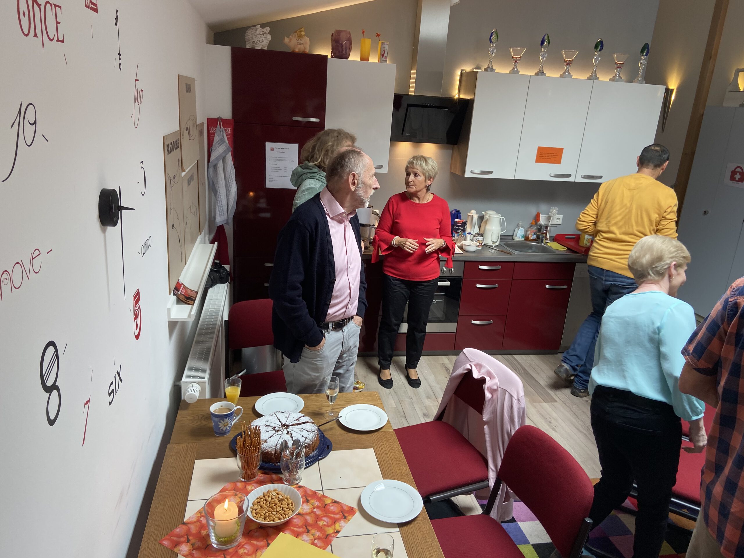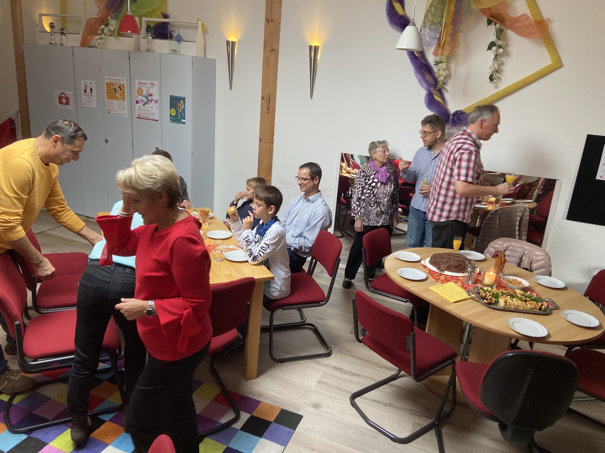 Die “Wiedereröffnung” des Clubheims ist für uns Tänzer natürlich eine willkommene Gelegenheit, eine Flasche Sekt zu öffnen und zu feiern. Außerdem mit Kaffee und Kuchen ausgestattet haben wir uns zusammen mit Bürgermeister Christian Schönung, Erstem Stadtrat Klaus Schwab und der Stadtverordnetenvorsteherin Christiane Ludwig-Paul sowie den Gründungsmitgliedern Hans-Jürgen und Brigitte Sander getroffen und gefeiert. Und neue Pläne wurden auch geschmiedet, denn im nächsten Jahr möchten wir unseren 40. Geburtstag feiern.